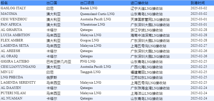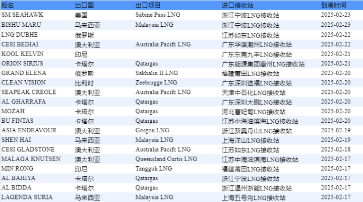 从到货地看,2月17日-2月23日当周,华南地区共接卸7船LNG,长三角地区接卸11船,环渤海地区接卸2船。其中,宁波LNG接收站到港3船,共计约19万吨,数量最多。